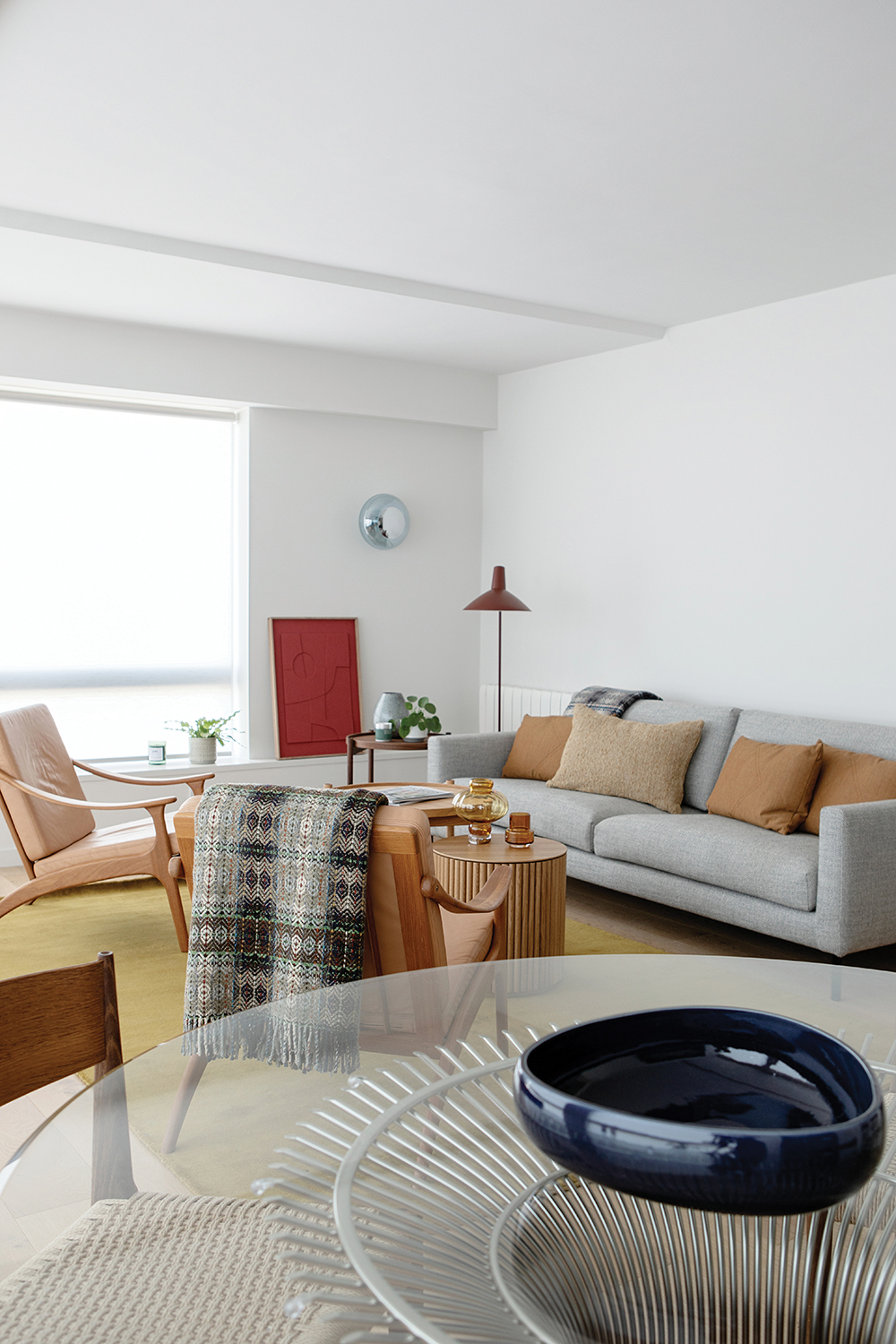 A view of the living area with the Friend sofa by Adea, a Finnish brand, upholstered in a textured wool mix. Instead of using one larger table, Moyna used a selection of smaller coffee tables in various oak finishes. The rug is by Massimo and the throws are by Molloy & Sons.