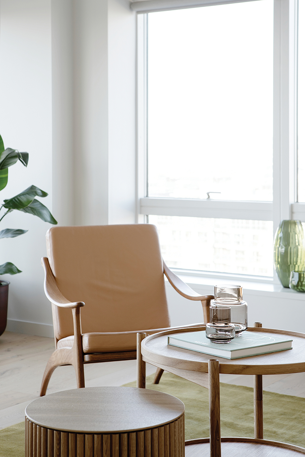 Lean Back armchair by Warm Nordic; the side table is by The Pair by Møbel; the round coffee table is the Petit Palais by Asplund.