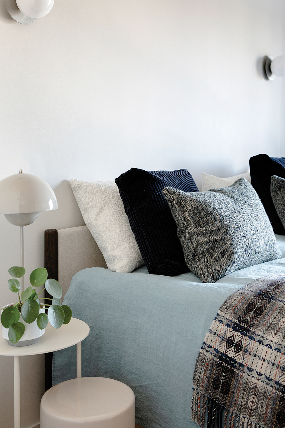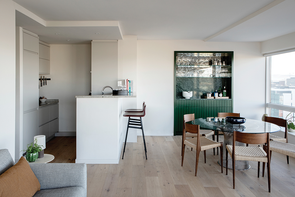In the living and dining space, a classic Platner glass table by Knoll, chosen for its light and sculptural shape, is surrounded by Pia chairs by dk3 in smoked oak with papercord woven seats. Rather than a single large coffee table, two Bølling tray tables on castors can be moved around easily and used anywhere. “The tray tops are removable too, so can be used as serving trays.” Two Lean Back armchairs by Warm Nordic are arranged opposite the Friend sofa by Finnish brand Adea which is upholstered in a textured wool mix. A wool rug by Massimo, throws by Molloy & Sons and a selection of cushions in different textures soften the strong lines. Moyna turned what was dead space in the recessed alcove into a focal point with a bespoke green marble-topped cabinet which is used as drinks cabinet and for storage. “It is smart and very practical, a useful and attractive focal point in a very simple space.”