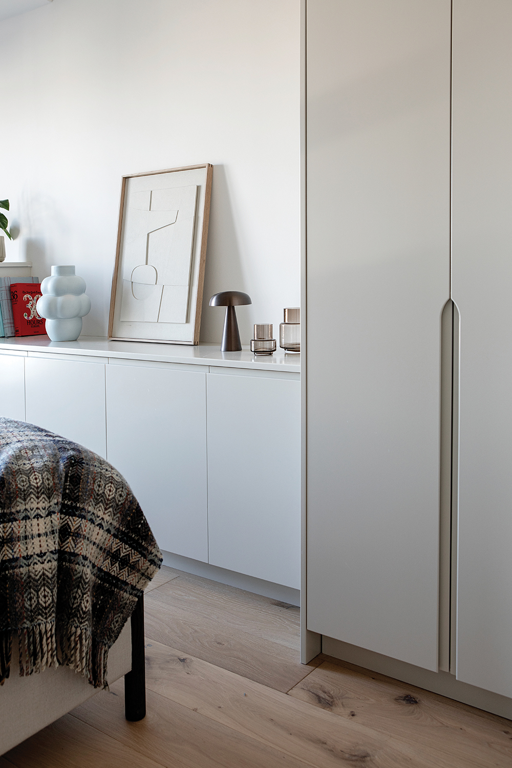 In the bedroom, the units were designed by Moyna and made by carpenter Shane Duffley in three different heights. The centre unit was set back to allow more space to walk around the bed and give a sense of space.
