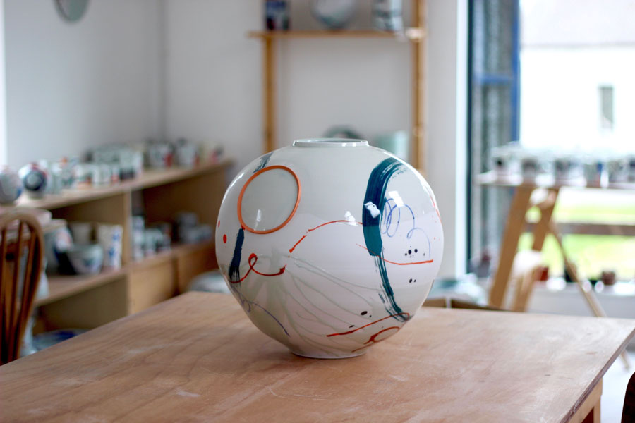 Adam Frew is a ceramic artist based in rural Northern Ireland. He creates vessels defined by clean, simple forms. Working primarily in porcelain, Frew uses the surface of each pot as a canvas. The white ground provides a blank surface for mark making, where contrasts between sharp lines, crayon-like scribbles, brush marks and sponged-back sections interact with both glazed and bare areas. His marks are continually evolving, with each piece informing the next.