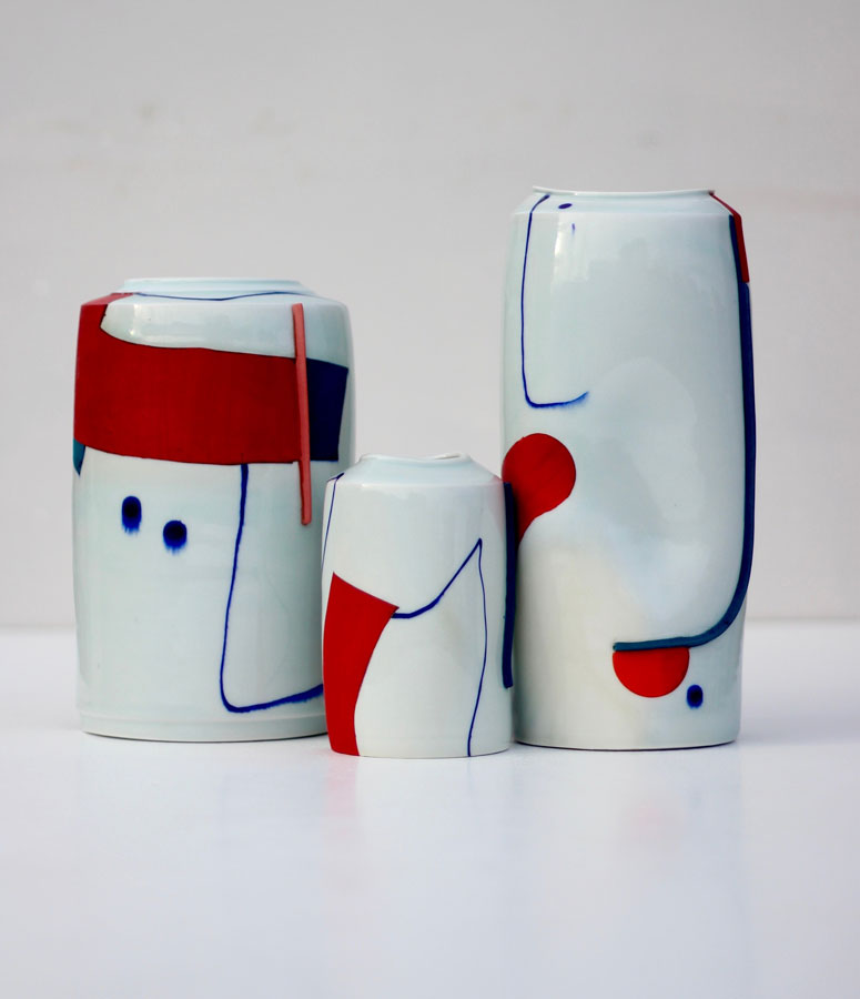 ‘Squashed Vases with Ridges and Red Shapes, 2025’