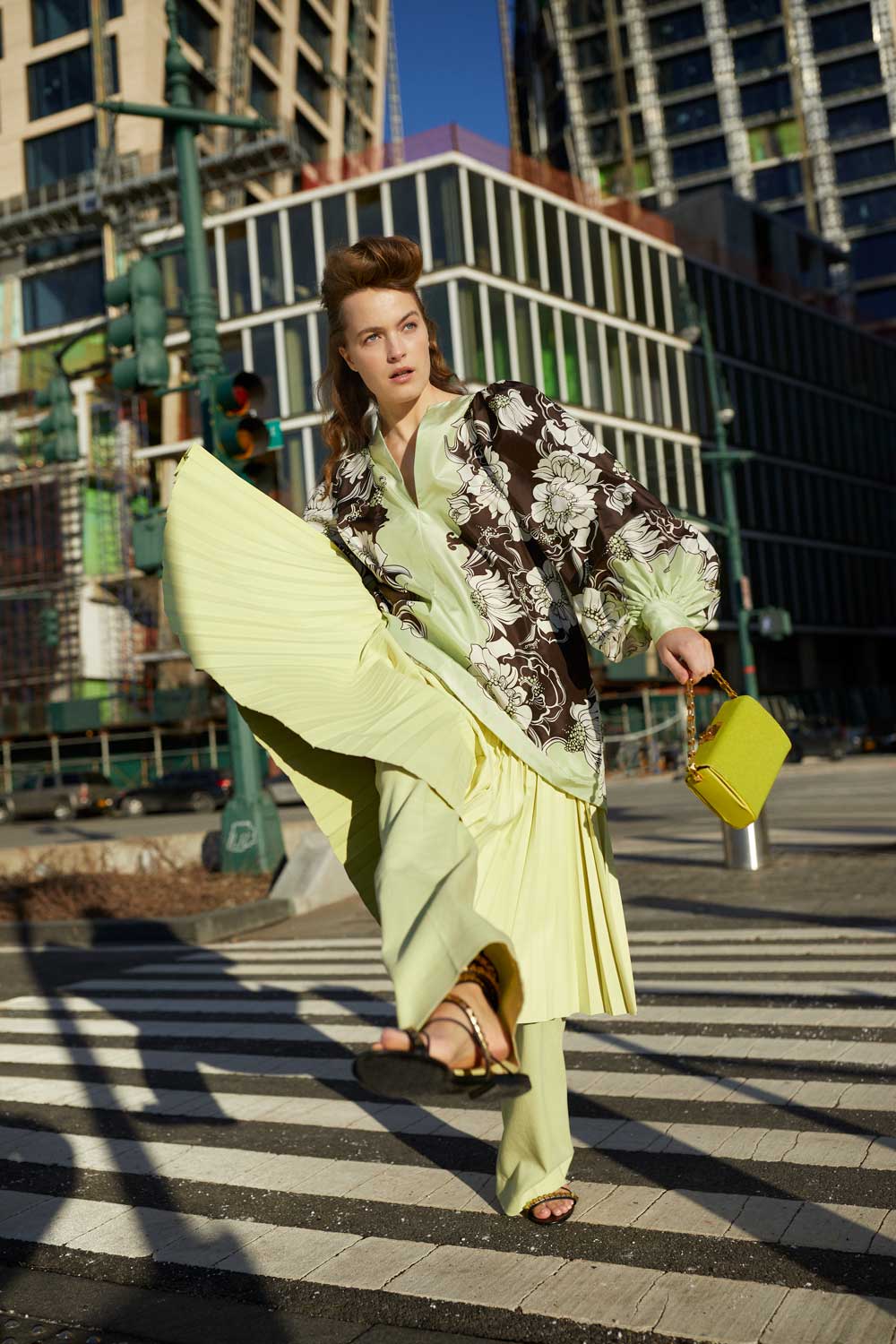 Esti wears: Sulphur pleated leather skirt, €1,685; sulphur shantung trousers, €475; both WWW.JOSEPH-FASHION.COM. Floral-print taffeta dress, €3,937; green Carry Secrets leather clutch, €1,610; gold Rockstud No Limit sandals, €2,732; all WWW.VALENTINO.COM.