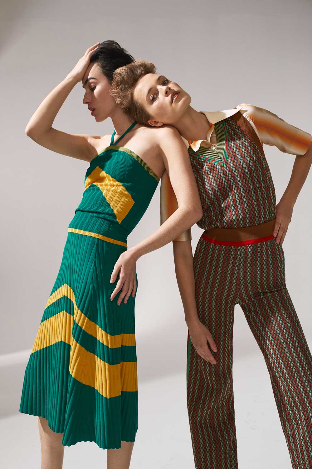 Marta wears: Green and yellow ribbed knit halter-neck top, €270; matching skirt, €380; both WALES BONNER at www.matchesfashion.com. Esti wears: Brown print Orchestre jacquard tank, €501; matching trousers, €636; orange short-sleeve shirt, €603; all WALES BONNER as before.