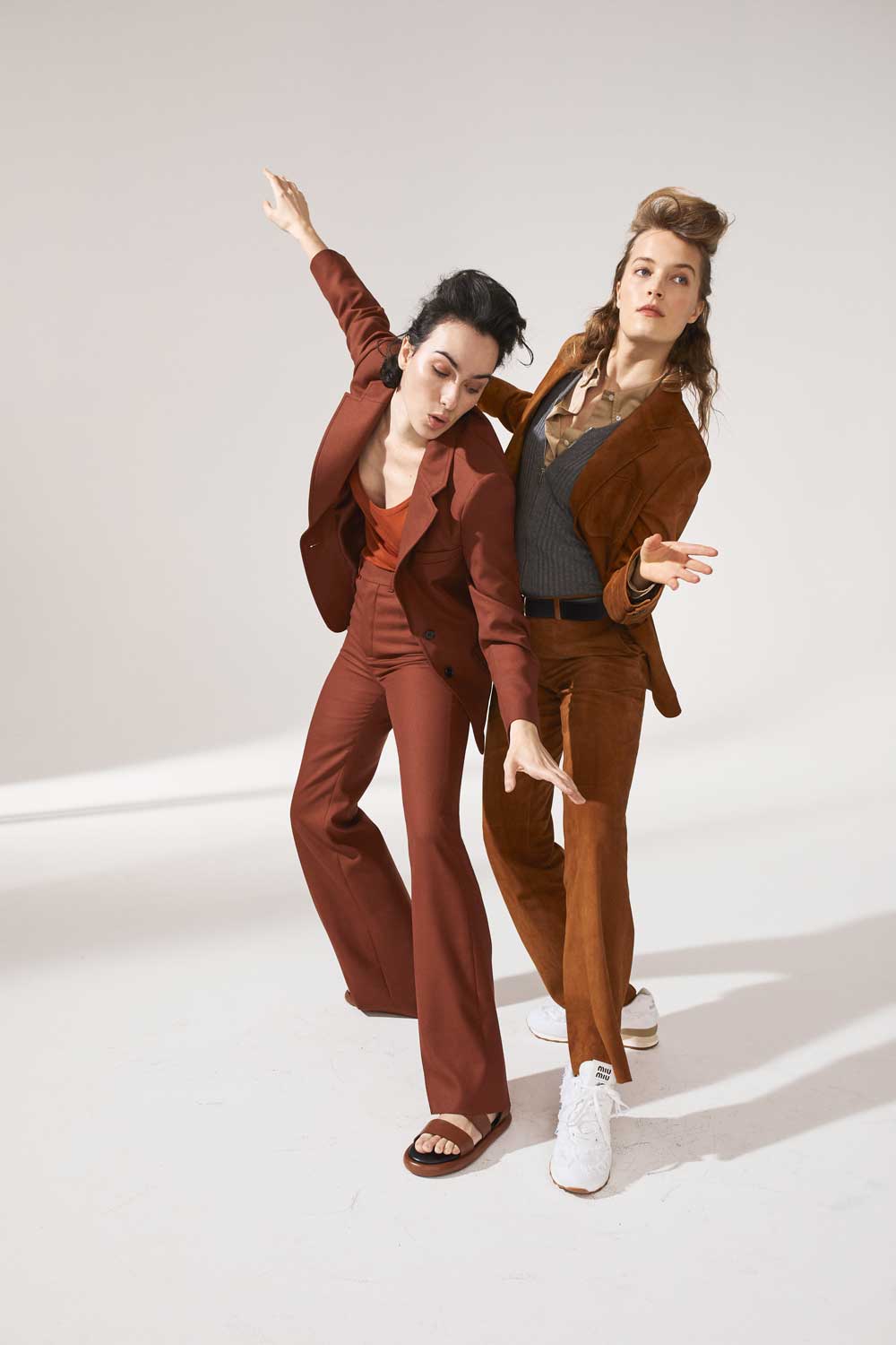 Marta wears: Clay wool and canvas tailored jacket, €2,190; matching cropped trousers, €950; knit tank, €390; all WWW.CHLOE.COM. Brown leather sandals, PROENZA SCHOULER, €388; www.mytheresa.com. Esti wears: Cinnamon brown suede jacket, €3,700; matching suede trousers, €2,700; grey cashmere cardigan, €1,500; beige button-down shirt, €540; black leather belt, €350; white 574s sneakers, New Balance X Miu Miu, €608; all WWW.MIUMIU.COM.