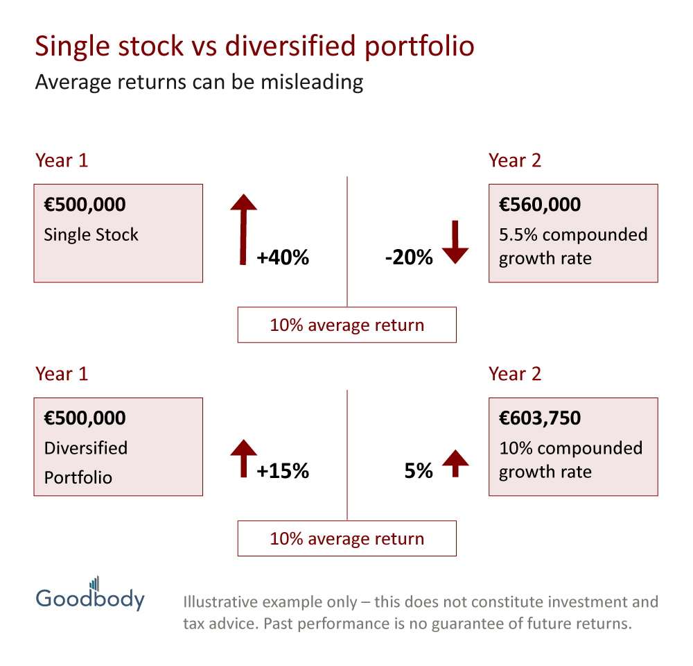 -The diversified portfolio went up 15% in year 1 and up 5 % in year 2, resulting in a 10% compound growth rate and a difference of over €100K.