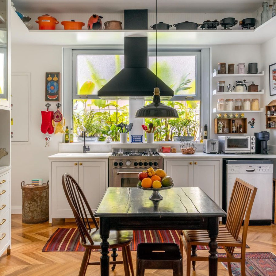 Everything is out in the open in this traditional kitchen, but that is what gives it its summery charm. One glance at the room and you know it belongs to someone who loves to cook. A Le Creuset dream! Open shelving is a very clever storage solution and is one with which you can have some fun with. See the Instagram post.