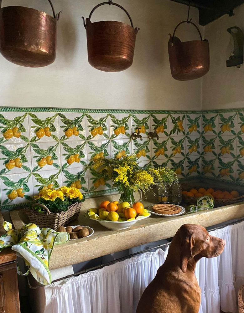 This narrow worktop space has been made heavenly by the decorative lemon tiles on the splashback. They are the perfect backdrop for the farmhouse style surroundings and hanging pots. See the Instagram post.