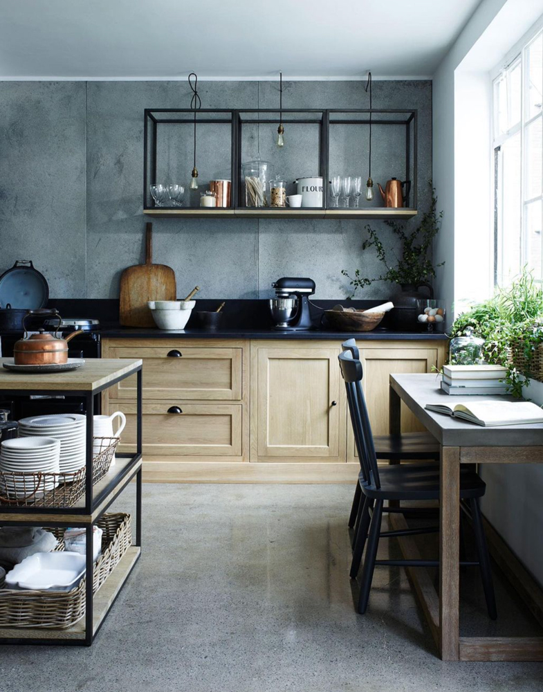 This Neptune kitchen boasts a very open and functional space. The steel, exposed oak, blackened steel and open shelving create a cool vibe for summer in this industrial style kitchen. See the Instagram post.