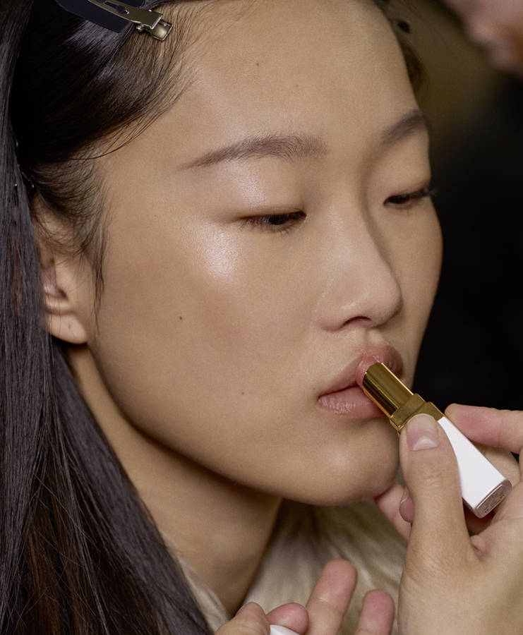 Lips are fresh and balmy. Chanel make-up artists used two shades, depending on the model’s skin tone: Rouge Coco Baume 912 Dreamy White, and Rouge Coco Baume 752 Honey Bliss.