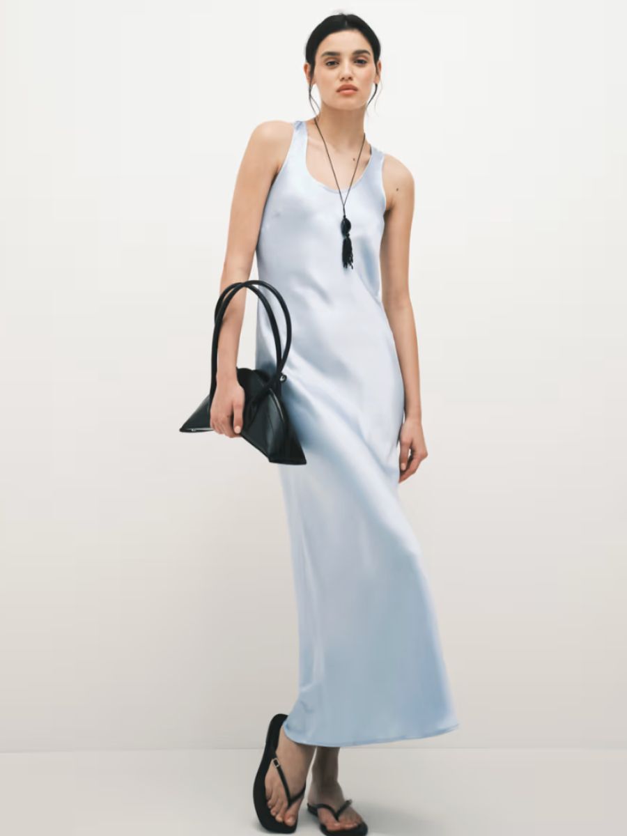 Pale blue scoop satin maxi dress, ASOS Design, €34.99; www.asos.com.