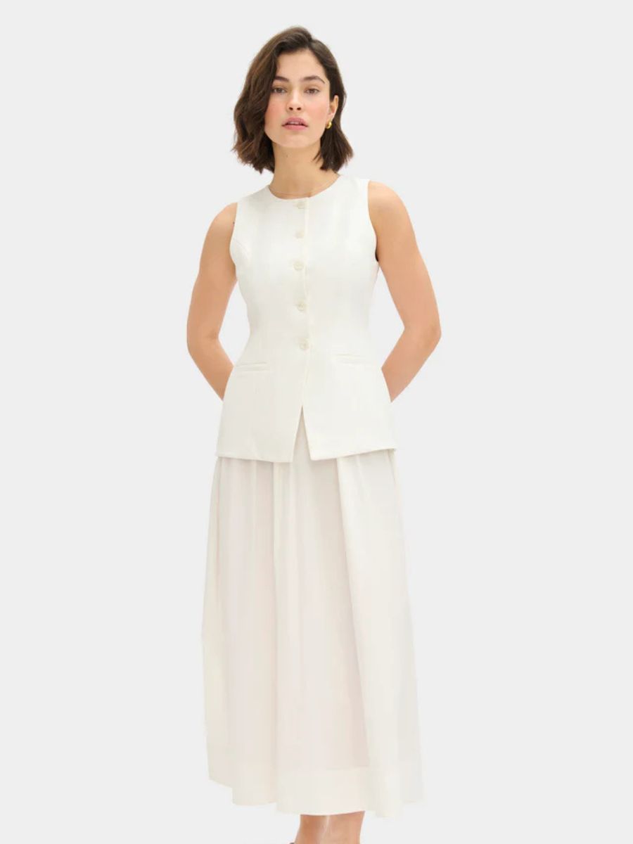 White Harley sleeveless waistcoat dress, €230; www.aligne.co.