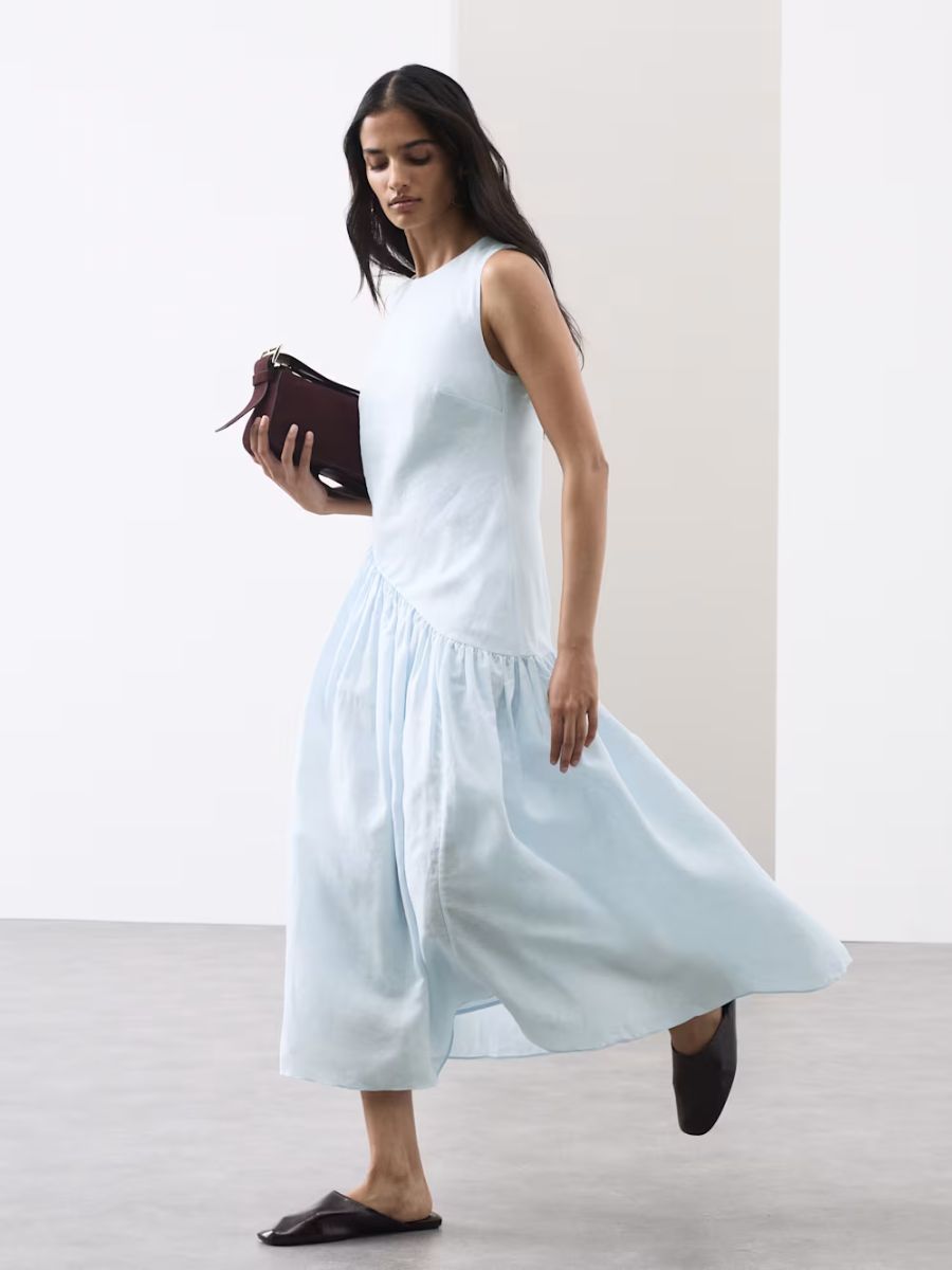 Dusty blue asymmetric linen-mix dress, Autograph, €140, at Marks & Spencer.
