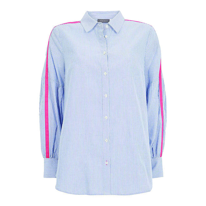 Blue and red puff-sleeve shirt, Mint Velvet, €99, at Mint Velvet, Dundrum Town Centre.