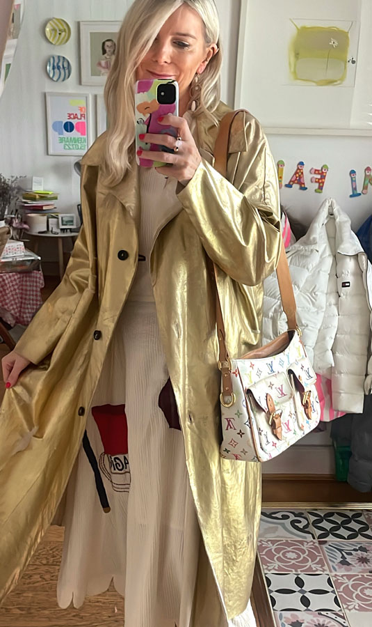 My biggest investment purchase was the gold Kindred of Ireland coat which I bought from designer Amy Anderson during her pop-up at Brown Thomas. I have worn it so many times since purchasing and it is a lovely addition to my growing Kindred collection. The piece that paid for itself in price per wear is a vintage Louis Vuitton Marc Jacobs X Takashi Murakami 2005 handbag from a Japanese seller. It brings me so much joy on a daily basis.