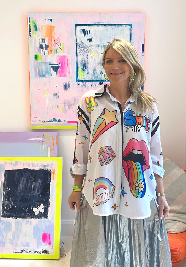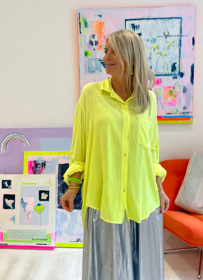 At the moment I am loving some brightly-coloured neon shirts from my own brand Begley & Bowie which can be dressed up with a skirt or worn more casually with trousers. I set up Begley & Bowie in 2019 as I wanted to create a colourful Irish brand which reflected my own style using high end, sustainable fabrics. The designs are based on my illustrations and paintings with a nod to my love of place and nature.
