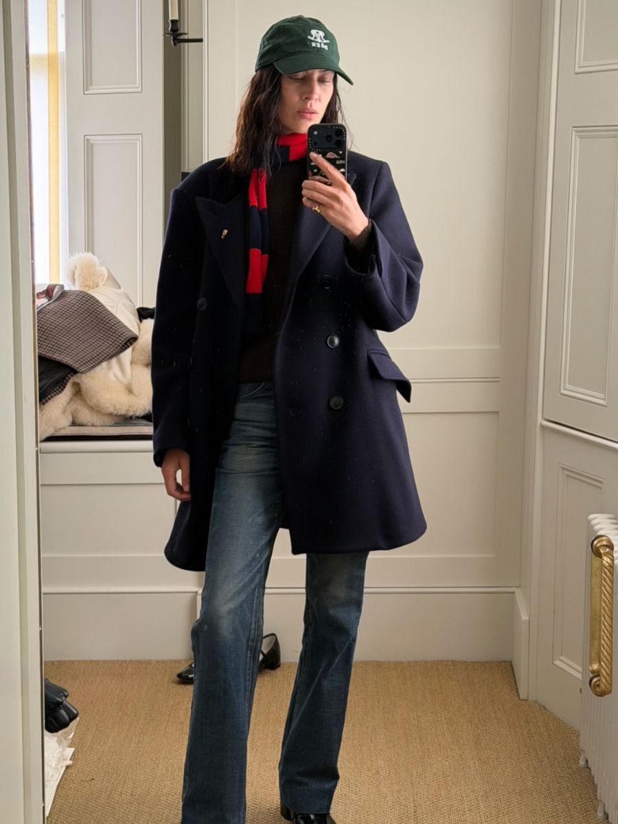 When she isn’t sitting on the front row for Jonathan Anderson’s first couture show at Dior, Alexa Chung is embracing a nostalgic 2000s trend by wearing a skinny striped scarf with a navy double-breasted coat, plus a bottle-green baseball cap and jeans.