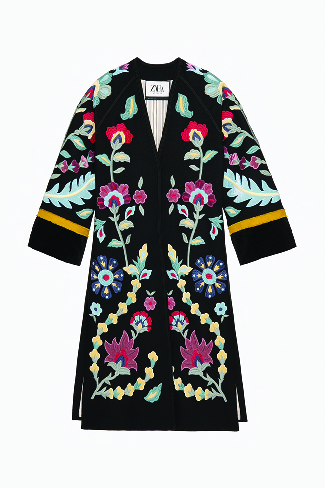 Black appliqué floral-motif coat, Limited Edition, €399, at ZARA.