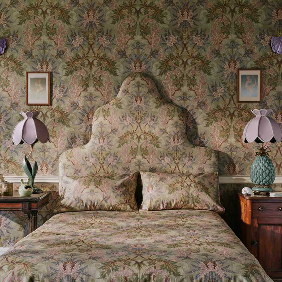 Aquifolia wallpaper in Apple, €285 a roll; headboard covered with Aquifolia linen, €195 a metre; both House of Hackney.