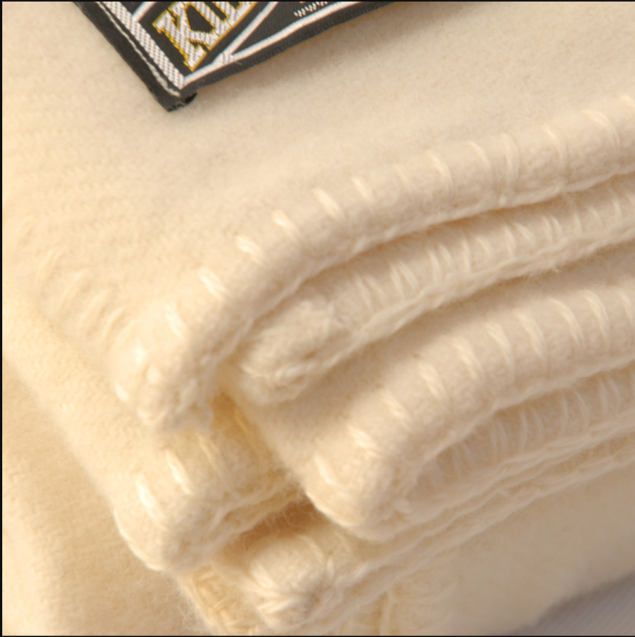 Cream wool blanket with blanket stitch trim, Kerry Woollen Mills X Stable Of Ireland, €260, at Stable Of Ireland, Westbury Mall, Dublin 2.
