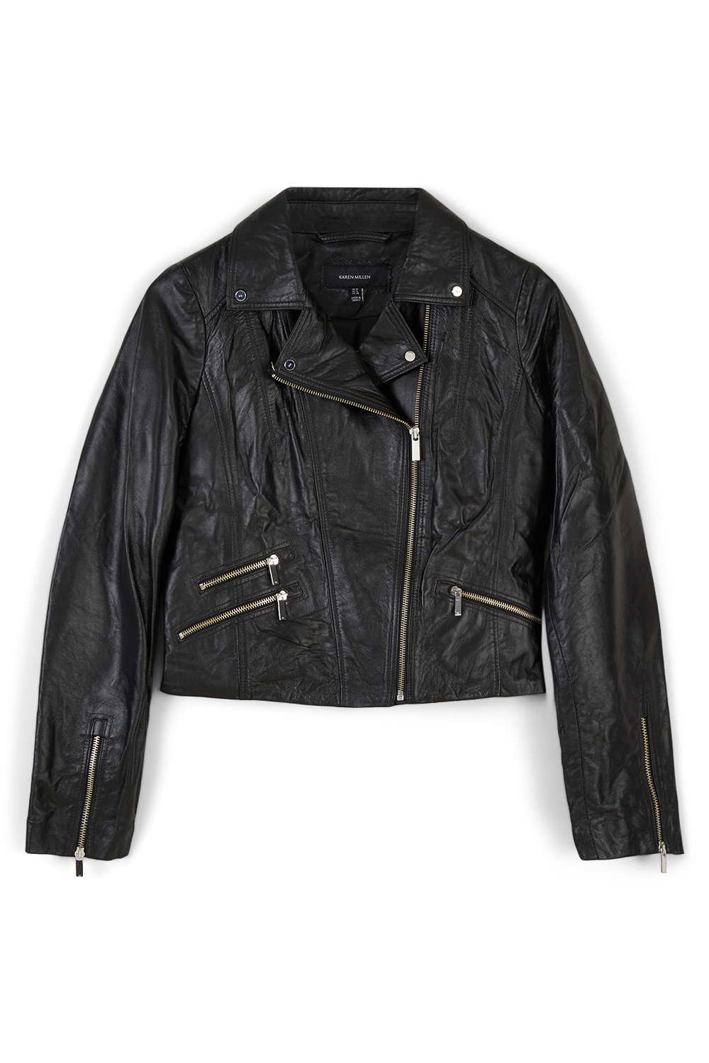 Black leather Signature biker jacket, €462; www.karenmillen.com.