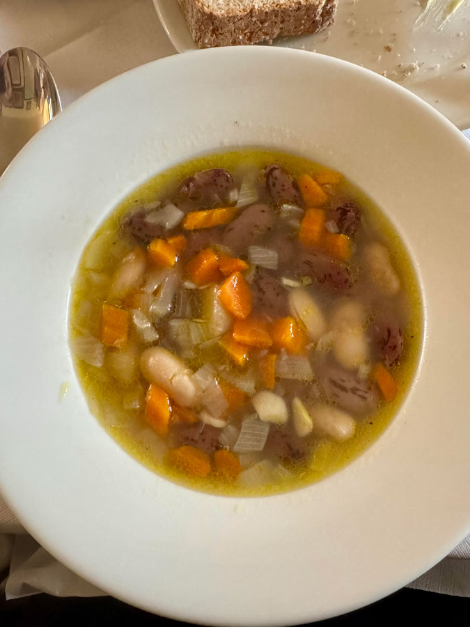 Lunch began with the now-famous wheaten bread, thick-cut and still warm from the oven. Then a vegetable and bean broth, clear and comforting, the sort of dish that feels restorative and hearty in equal measure. Next came the vol-au-vent, all flaky pastry and umami depth. Then the roast pork – a generous cut, served with slow-cooked onions and a green salad. The meat was tender, flavoursome and perfectly seasoned, though I couldn’t help thinking it cried out for a few floury potatoes to mop up the juices. But that’s the Irish answer. To drink, Corcoran recommended a La Musa Nebbiolo from Irish winemaker Deirdre O’Brien, which turned out to be the perfect partner: light, aromatic and dangerously moreish.