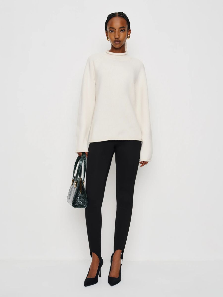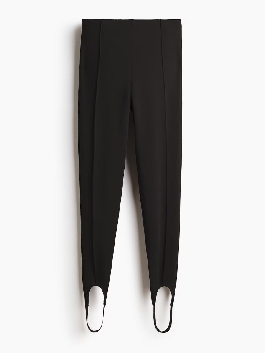 How to wear them now? Our favourite way to embrace the stirrup leggings trend is quite simple. Team them with a pair of black ballet flats and an oversized cashmere funnel neck jumper (look to COS for great options here). If you’re seeking something with a little more edge, trade the ballet flats for a pair of mannish loafers or trending slippers. Finish with a (long) coat that stretches towards your calves for an expensive look. Shop an edit of the best stirrup leggings for spring below.