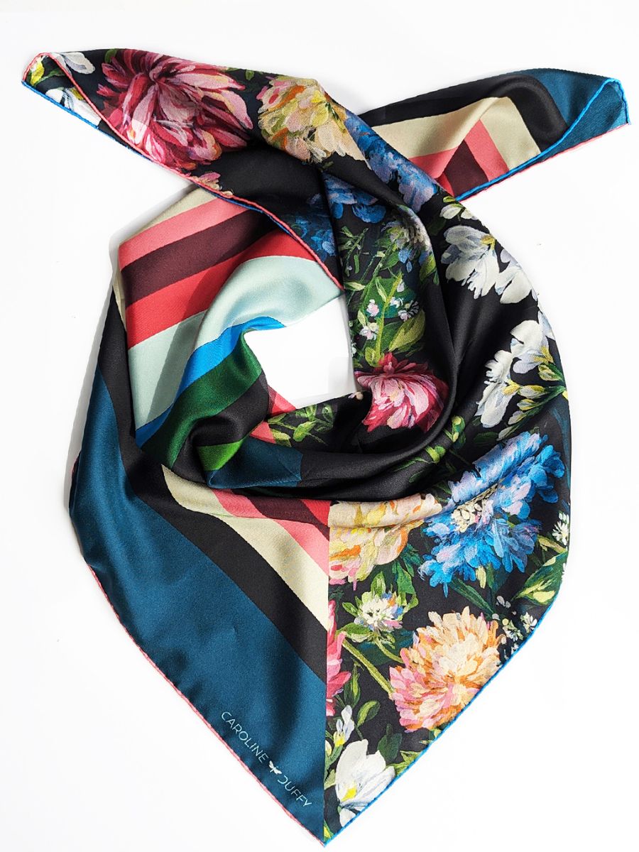 Multi-colour Flora printed silk scarf, €185; www.carolineduffydesigns.com.