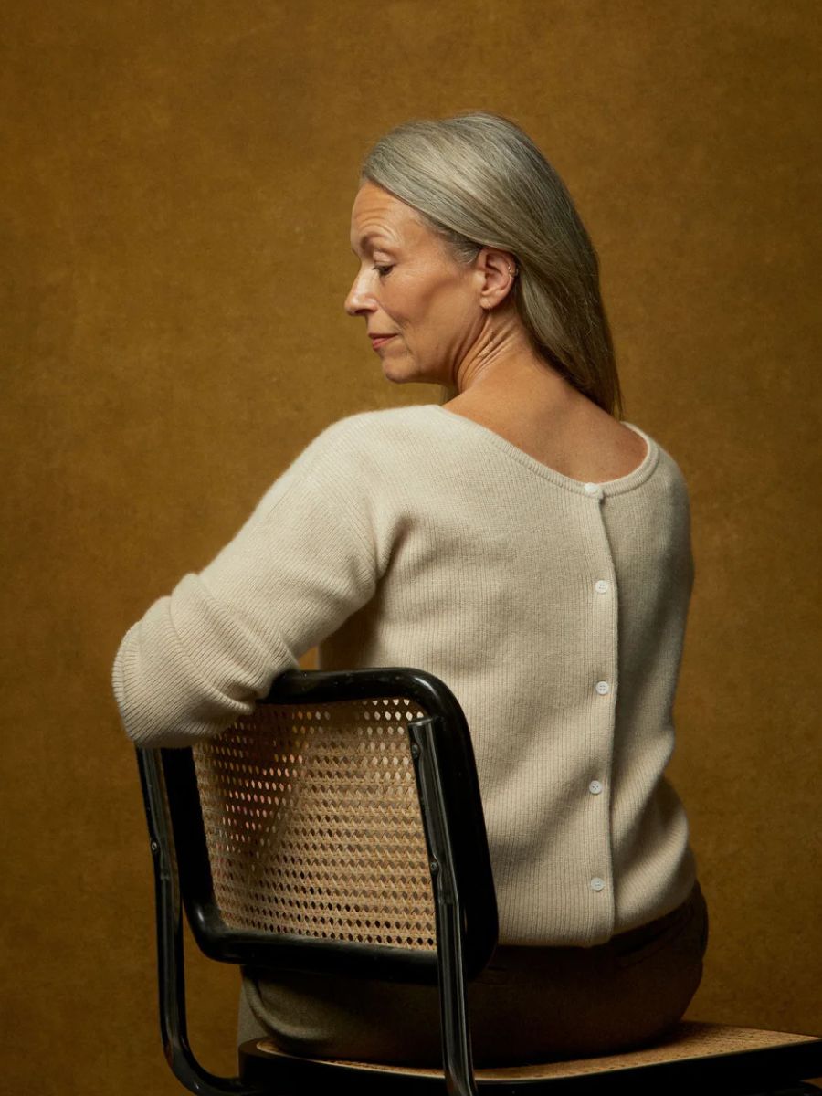 Latte Greta cashmere cardigan, €250, at Helen McAlinden.