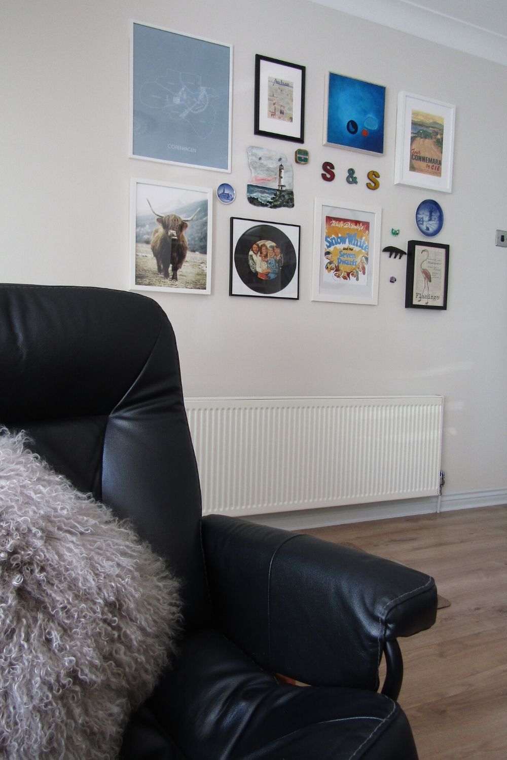 This is my gallery wall – a snapshot of my personality! It sits against a Colourtrend “Temperance” Interior Matt finished backdrop. This is the perfect neutral base as it’s warm, fresh and bright. Each piece has been carefully chosen with some representing fond memories. I have original artwork from Anne Harkin-Petersen, vintage Royal Copenhagen plates (I’m half-Danish), a lighthouse painted slate from a local artist in Wexford, a Copenhagen print, Connemara/Aran Islands vintage prints, Snow White film poster (the first film my partner saw in the cinema), an old Lakerol Throat Pastille tin from the depths of my Father’s wardrobe, a woolly sheep, a Flamingo print (my Dad’s nickname), a framed ABBA record and a Scottish Highland cow print – one of my favourite animals!