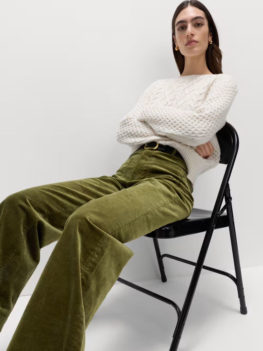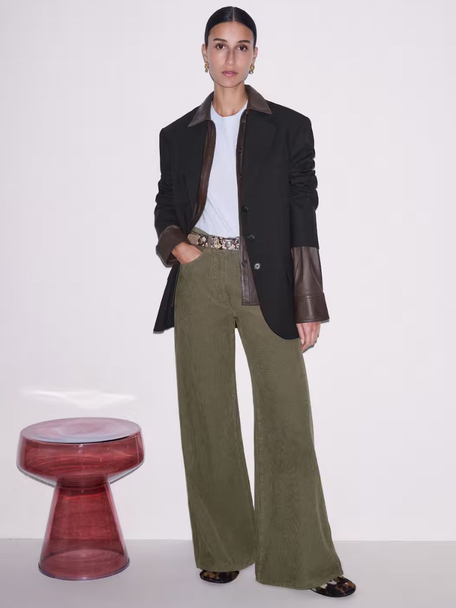 Play with proportion: a wide leg has a bit of drama. Pair your trousers with square-toe boots or loafers. Olive cord wide-leg trousers, €57, at Marks & Spencer.