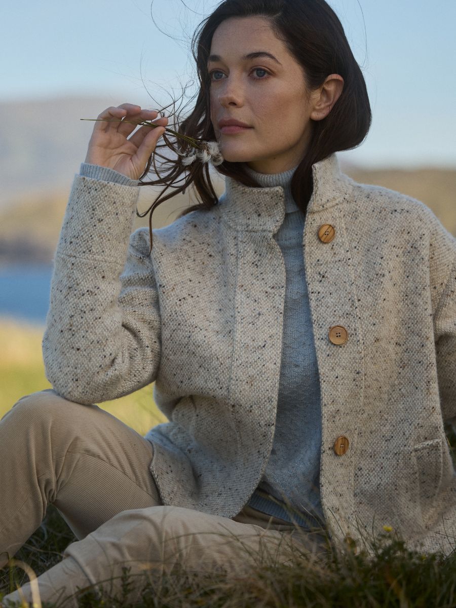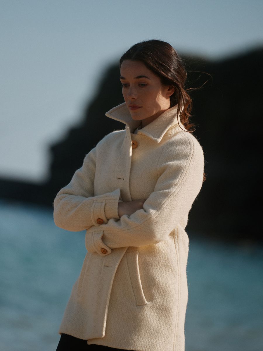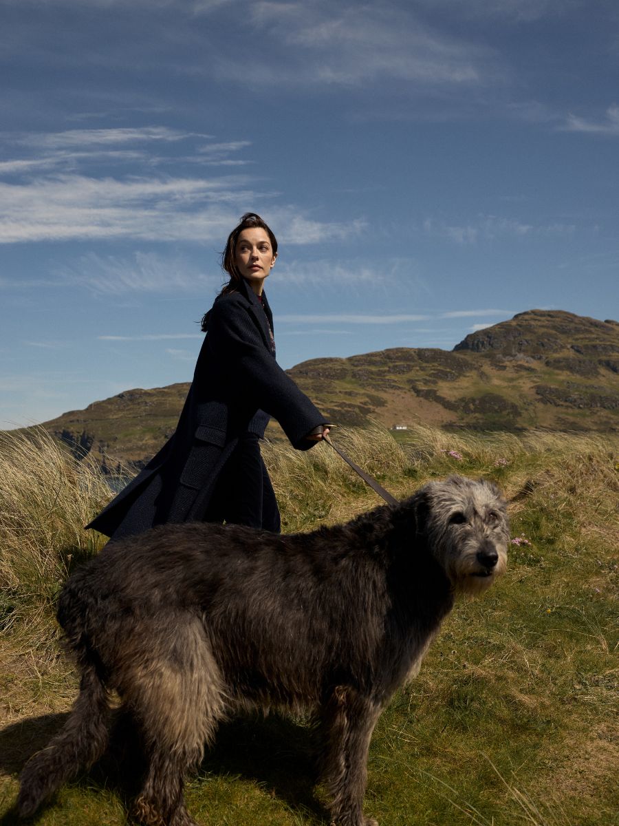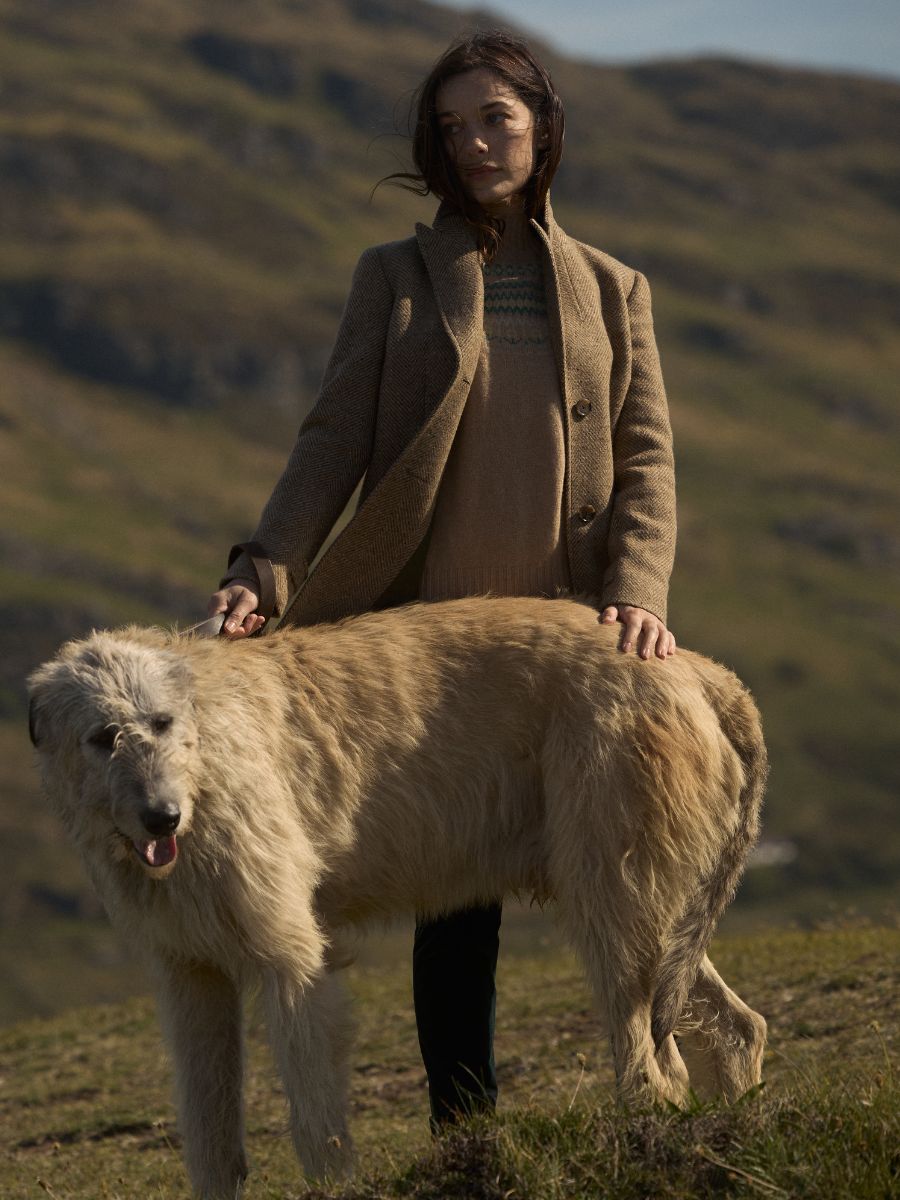 At Magee 1866, the fifth-generation family brand heroes Donegal tweed – a fabric which, it is hoped, will be awarded Protected Geographical Indication (PGI) status later this year, in a nod to its rich provenance. Take, for instance, the Arlene herringbone Donegal tweed coat with its classic sloped shoulders, or the Sophie full-length coat which comes in a crisp – and wearable – navy blue, both below. Team the latter with barrel jeans and loafers to tap into the off-duty outfit formulas of the season. Magee 1866 further celebrates indigenous fashion: the independent brand has long-focused on including Irish wool in specialist yarns. This season, that includes the striking Olivia cropped coat which comes in a báinín barley corn pattern, below. It’s a look that boasts equal appeal for country exploring as it does for walking the city streets.