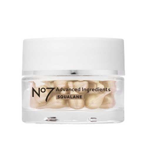 Last but not least, No7 Advanced Ingredients Squalane capsules contain just one single ingredient – 100 per cent plant-derived Squalane, an ingredient proven to strengthen the skin’s moisture barrier and help to prevent trans-epidermal water loss (when water passes from the dermis through the epidermis and evaporates into the air). So skin will feel softer, smoother and nourished. There aren’t many pure squalane products on the market, and this is a great option for all skin types.