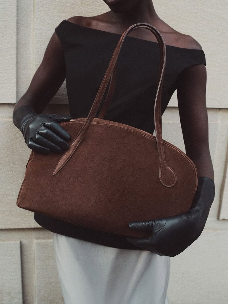 Dark brown suede bowling bag, €675; www.liffner.co.