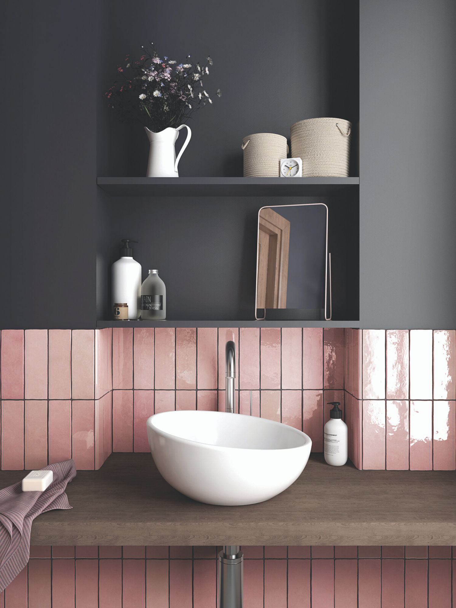 Millennial pink works brilliantly in bathroom settings. Solid colour is the obvious way to introduce this on-trend shade. If you fancy a pink floor tile, and love the terrazzo look but don’t want the hassle of upkeep and maintenance, Versatile has the solution – try South Pink’s terrazzo-look porcelain tiles, moisture resistant and easy to clean. For a mosaic finish, try Fired Earth’s Alchemy pure aluminium mosaics in Pink Gin Chevron.