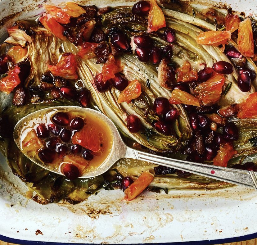 Season the chicory with pepper (the lardons are salty enough), garnish with the pomegranate and orange and serve nice and hot.