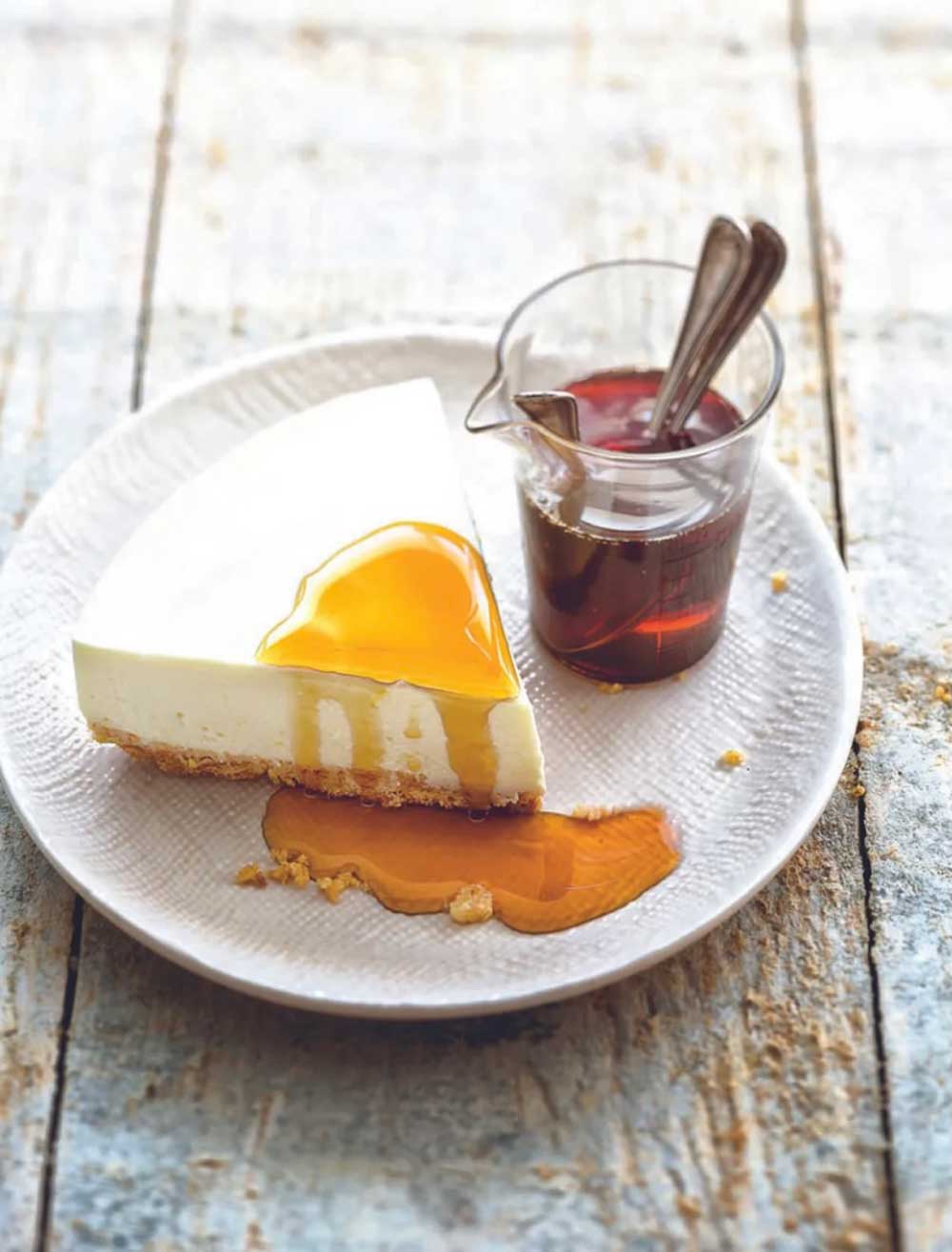 Place in the fridge for 2–3 hours. Before serving, combine the maple syrup with the bourbon and serve this syrup alongside the cheesecake.