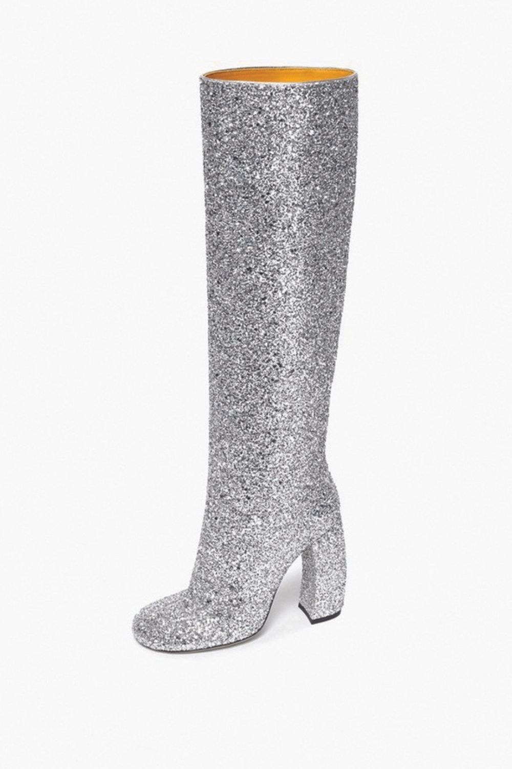 Silver glitter knee-high leather boots, €795; www.victoriabeckham.com.