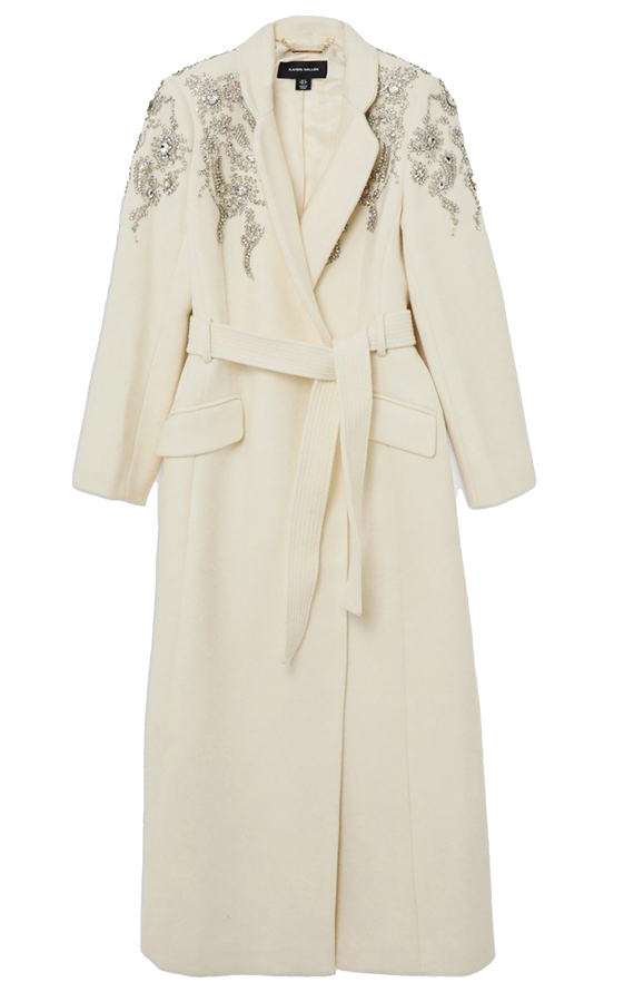 Cream crystalembellished wool coat, €445.64; www.karenmillen.com.