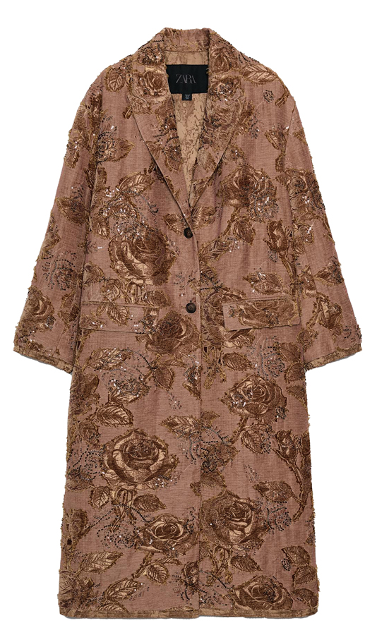 Brown embroidered bead-appliquéd coat, €199, at Zara.