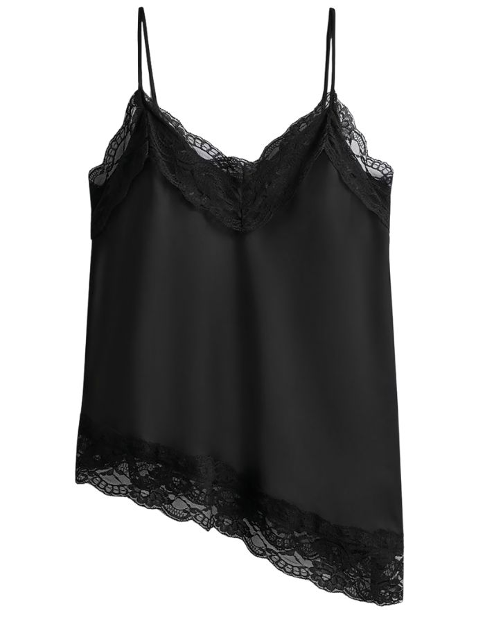 Black asymmetric satin and lace camisole, €16, at Penneys.