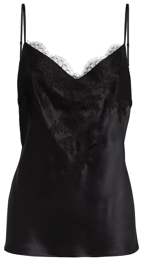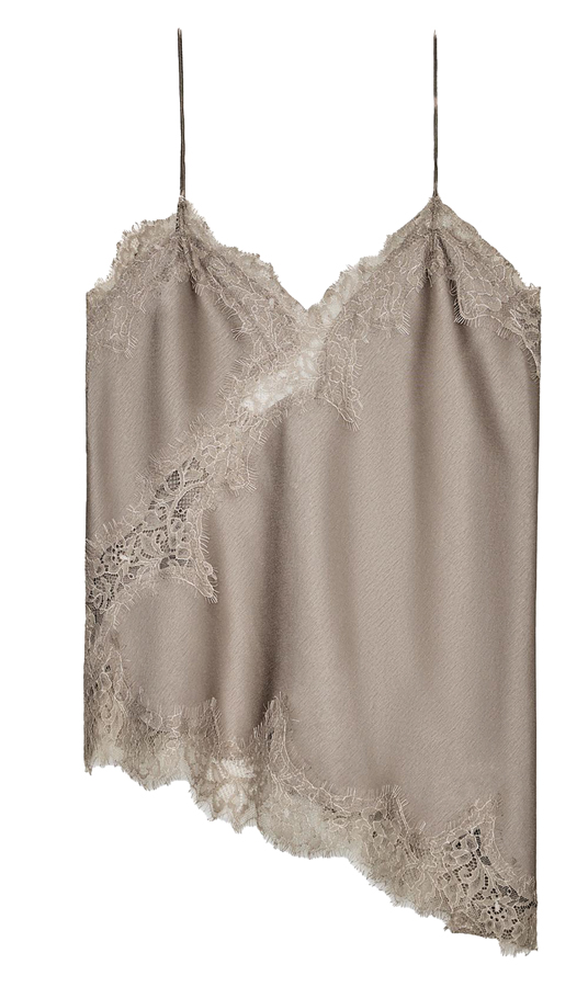 Lacetrimmed camisoles, inspired by French lingerie, are the perfect peekaboo addition to a tailored jacket and trousers, imbuing them with a rock-and-roll edge. Look to Anine Bing or Kate Moss for styling inspo – each wears the cami with aplomb. Designer Nili Lotan toughens hers up with high-waisted trousers, a mannish leather belt and a mock-croc clutch (all in black, of course). Or take inspiration from the Chloé AW25 runway and wear yours with a velvet military jacket, flowing, romantic skirt and a gypset leather belt.