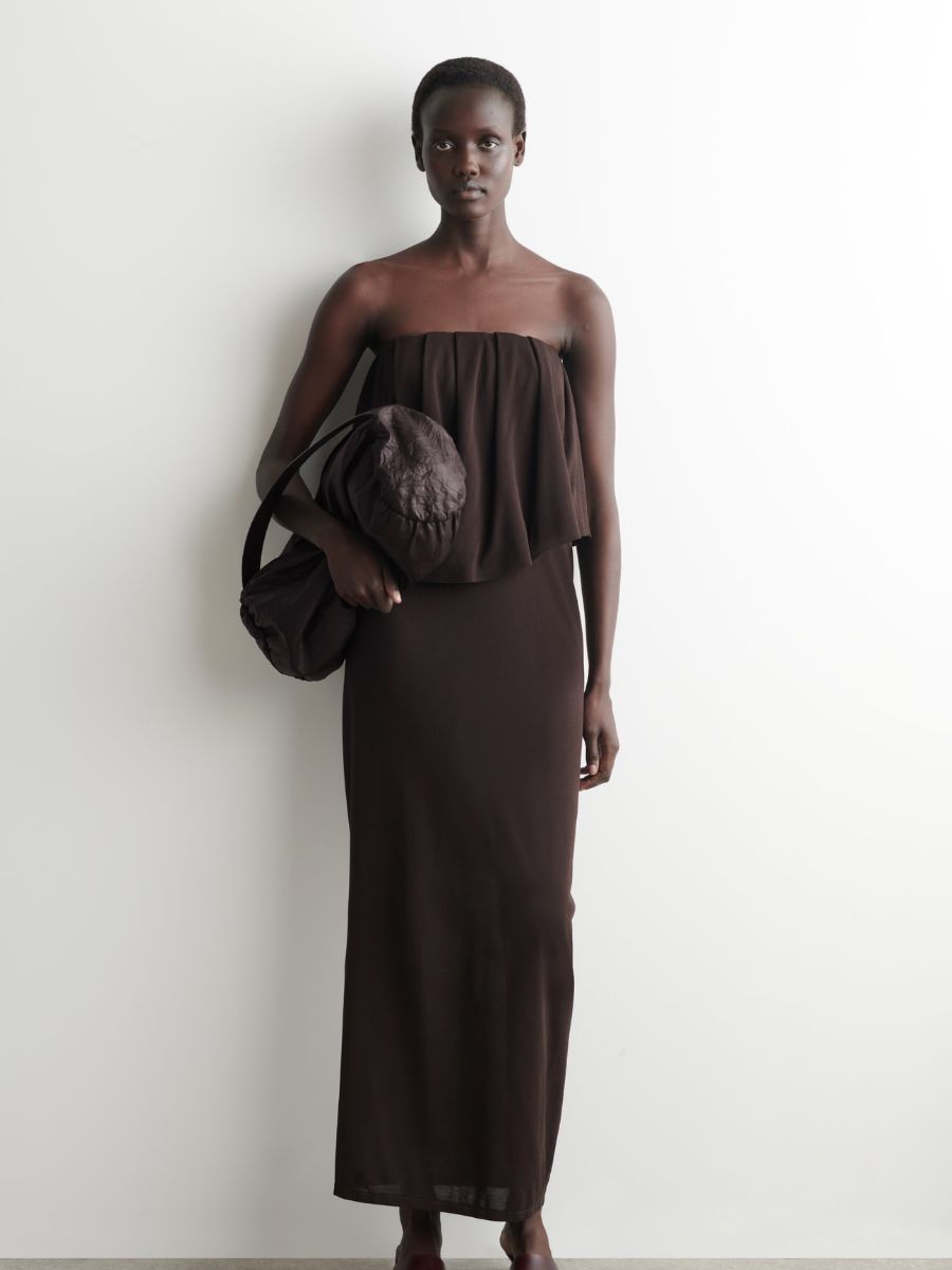 Bitter chocolate bandeau maxi dress, €199, at COS.