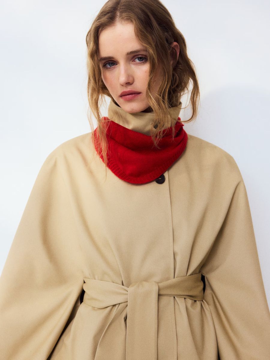 This season, cropped cape trench coats are popular again – they look particularly good when styled with a pop of red. Beige twill cape jacket, €34.99, at H&M.