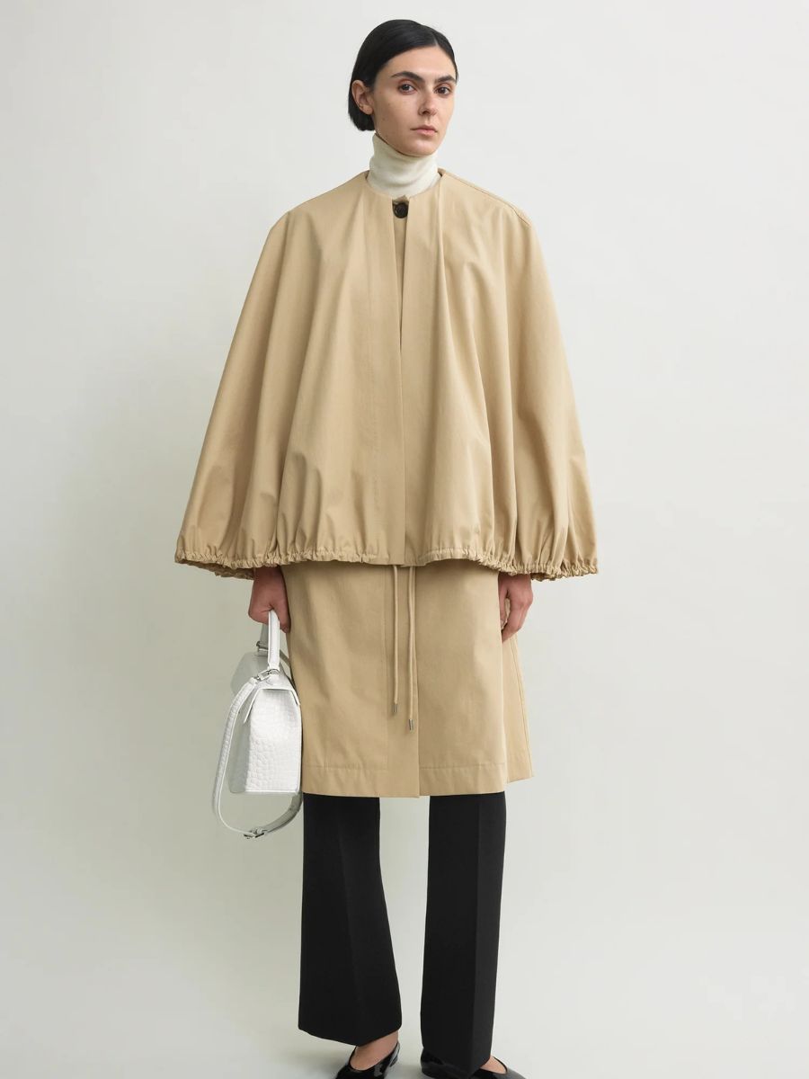 At the investment end of the scale, Toteme‘s cotton trench with detachable cape makes a statement. Beige cape coat, €1,340; www.toteme.com.
