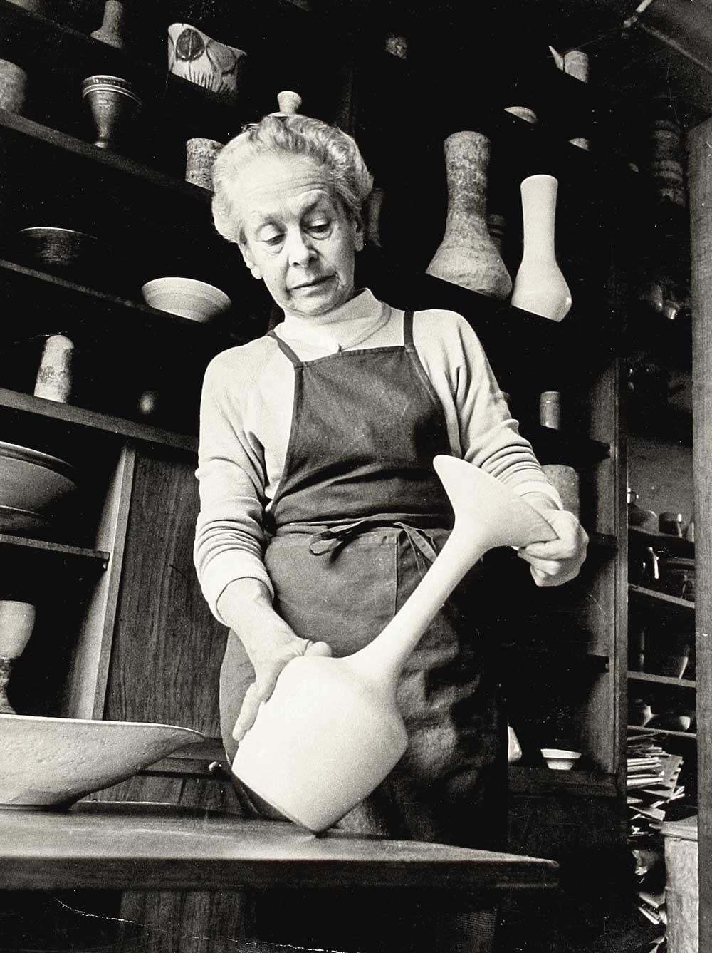 Photograph via ESTATE OF LUCIE RIE. Ceramicist Lucie Rie was born and raised in Austria, fleeing to London in 1938. Here is Rie, with an example of her work, in her potter’s apron.