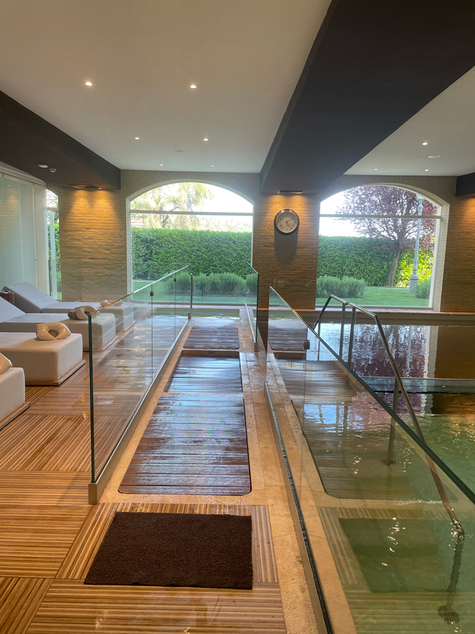 There are various indoor and outdoor pools – I had the enormous Art Deco pool to myself the entire few days I visited (it’s slightly chilled, and exhilaratingly beautiful), where I imagine previous Palazzo visitors such as Picasso doing his best breaststroke. Another pool looks out over the hillside town, a triangle of buildings the faded colours of Neapolitan ice cream. You spend a lot of time going from hot to cold here, with the salt room, stream and infrared sauna as well as icy plunge pools. All the facilities are exceptional. The Palazzo has the most glamorous, high-tech gym I’ve ever seen, in the enormous light-filled Ballroom.