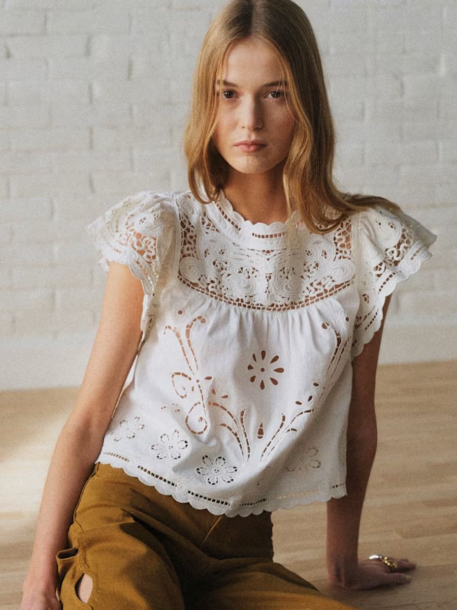 Ecru Hella embroidered cotton scallop-edge blouse, Sézane x Sea New York, €150; www.sezane.com.