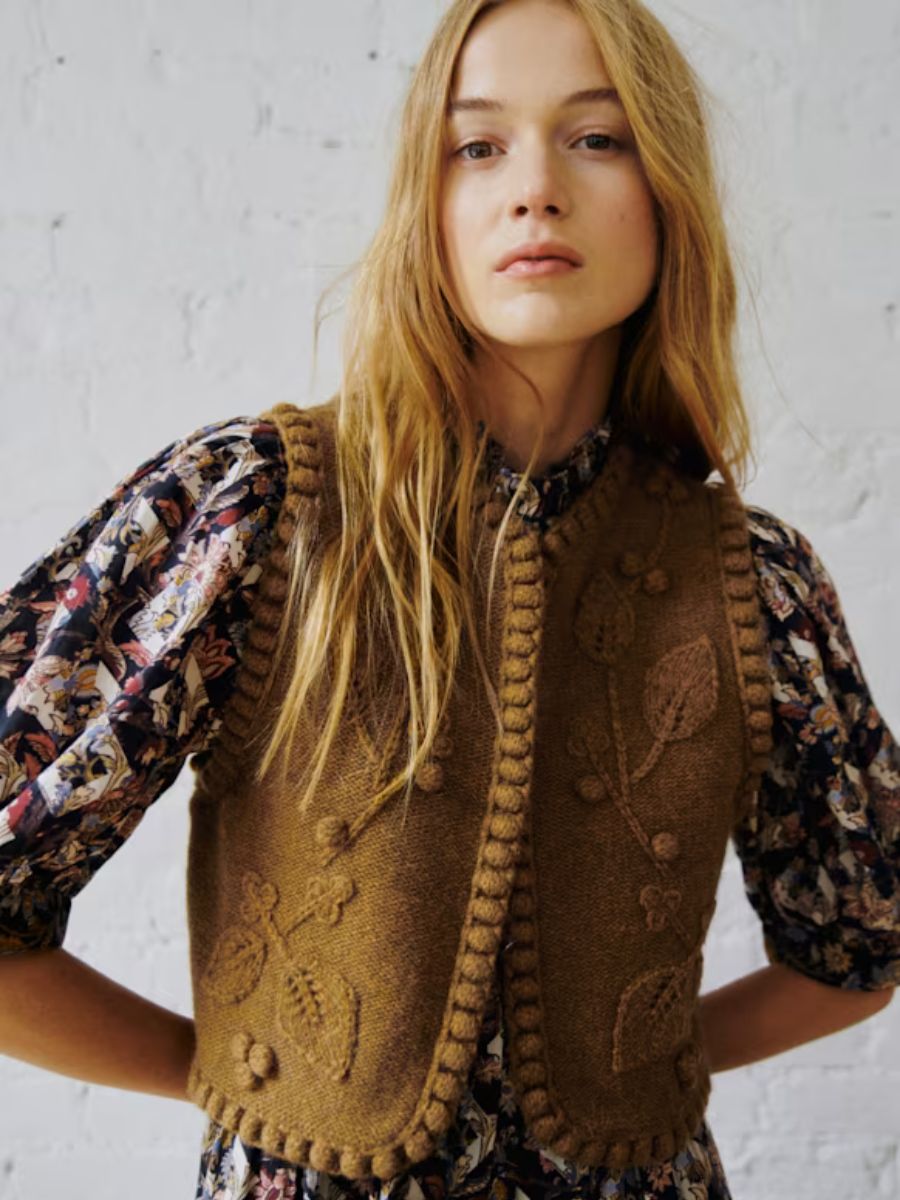 Bronze Nate merino wool- and alpaca-blend embroidered cardigan, €140; www.sezane.com.
