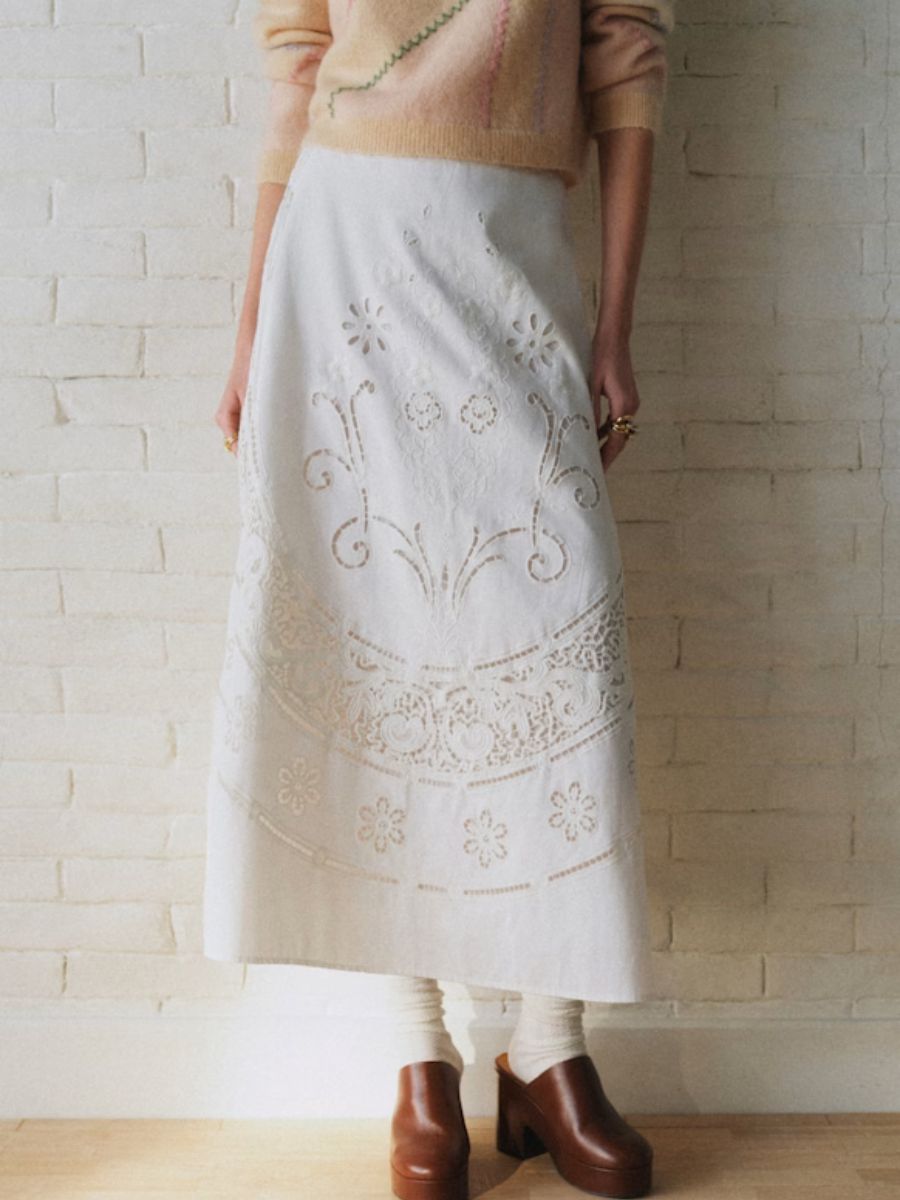 Ecru Solya embroidered cotton skirt, Sézane x Sea New York, €180; www.sezane.com.
